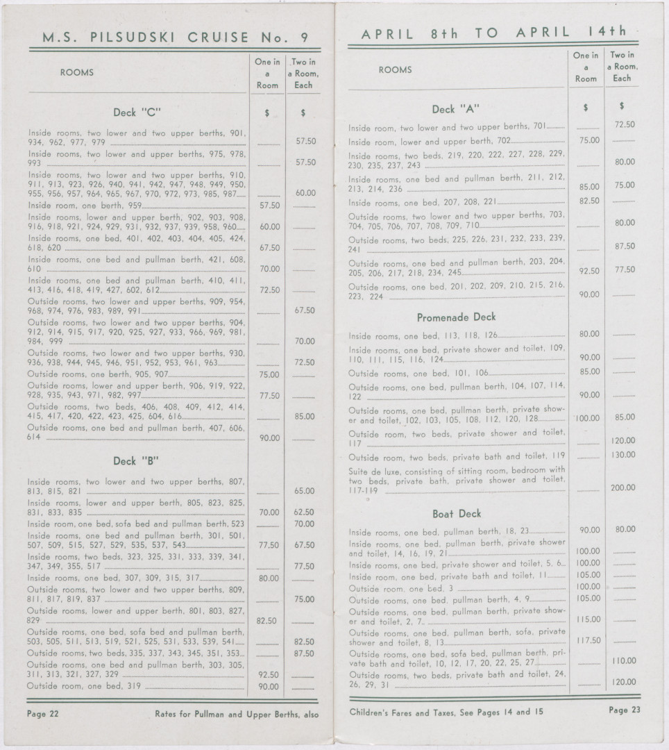 Folder reklamowy GAL - “M.S. PILSUDSKI, Fiesta Cruises to the heart of the Spanish main – intineraries and rates”, zawierający terminy i ceny 10 wycieczek z Nowego Jorku do m.in. Nassau, Hawany, Curacao. Wymiary: 10x23 cm.