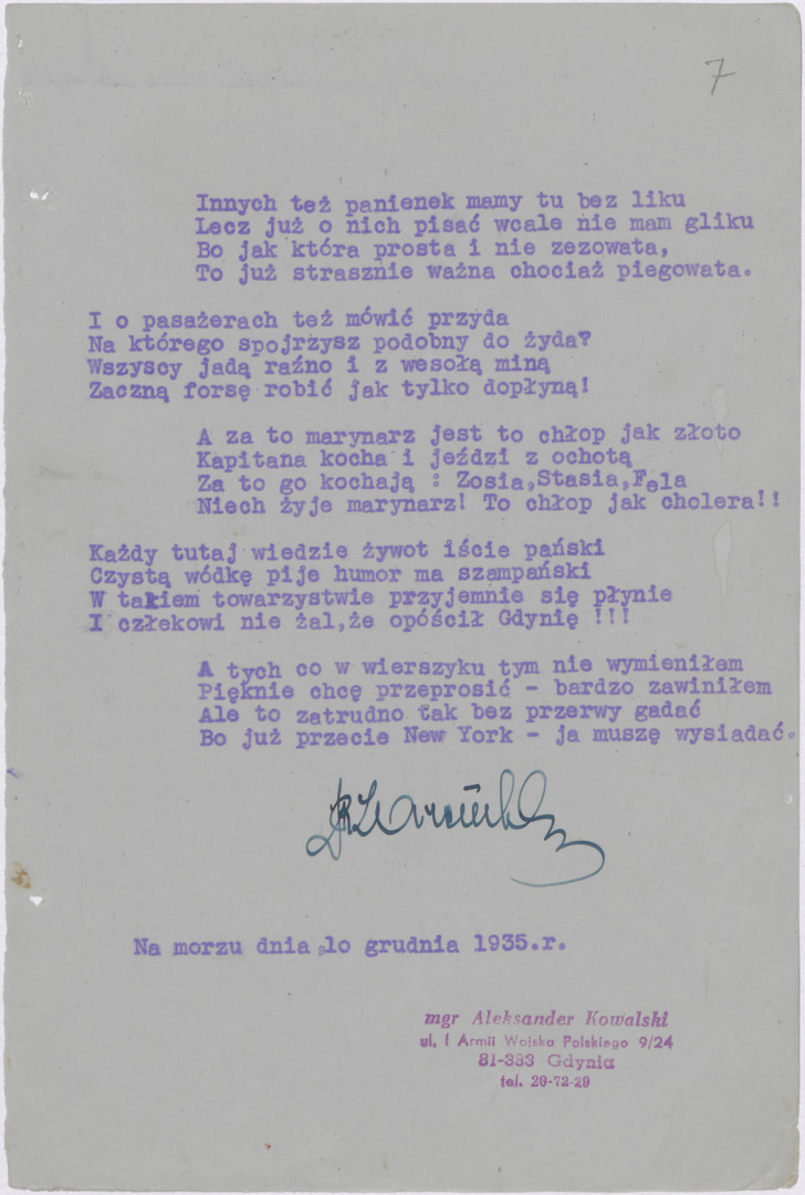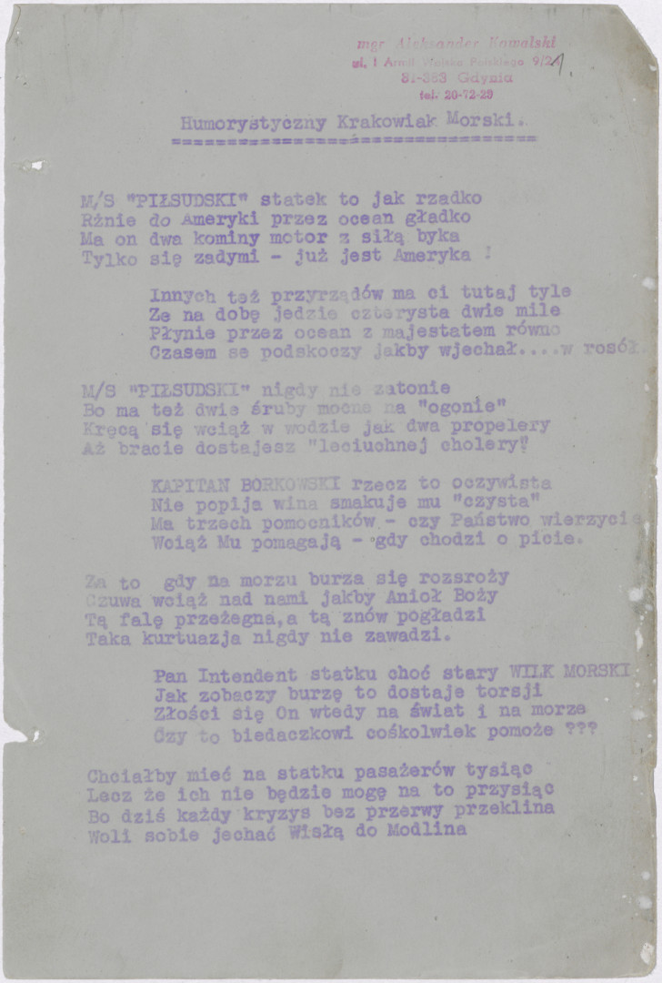 “Humorystyczny Krakowiak Morski”, maszynopis - 7 stron (brak 5 strony). Tekst dedykowany Dyrektorowi GAL – Romanowi Kutyłowskiemu. Maszynopis znajduje się w dwóch okładkach GAL. Wymiary: 15x22 cm