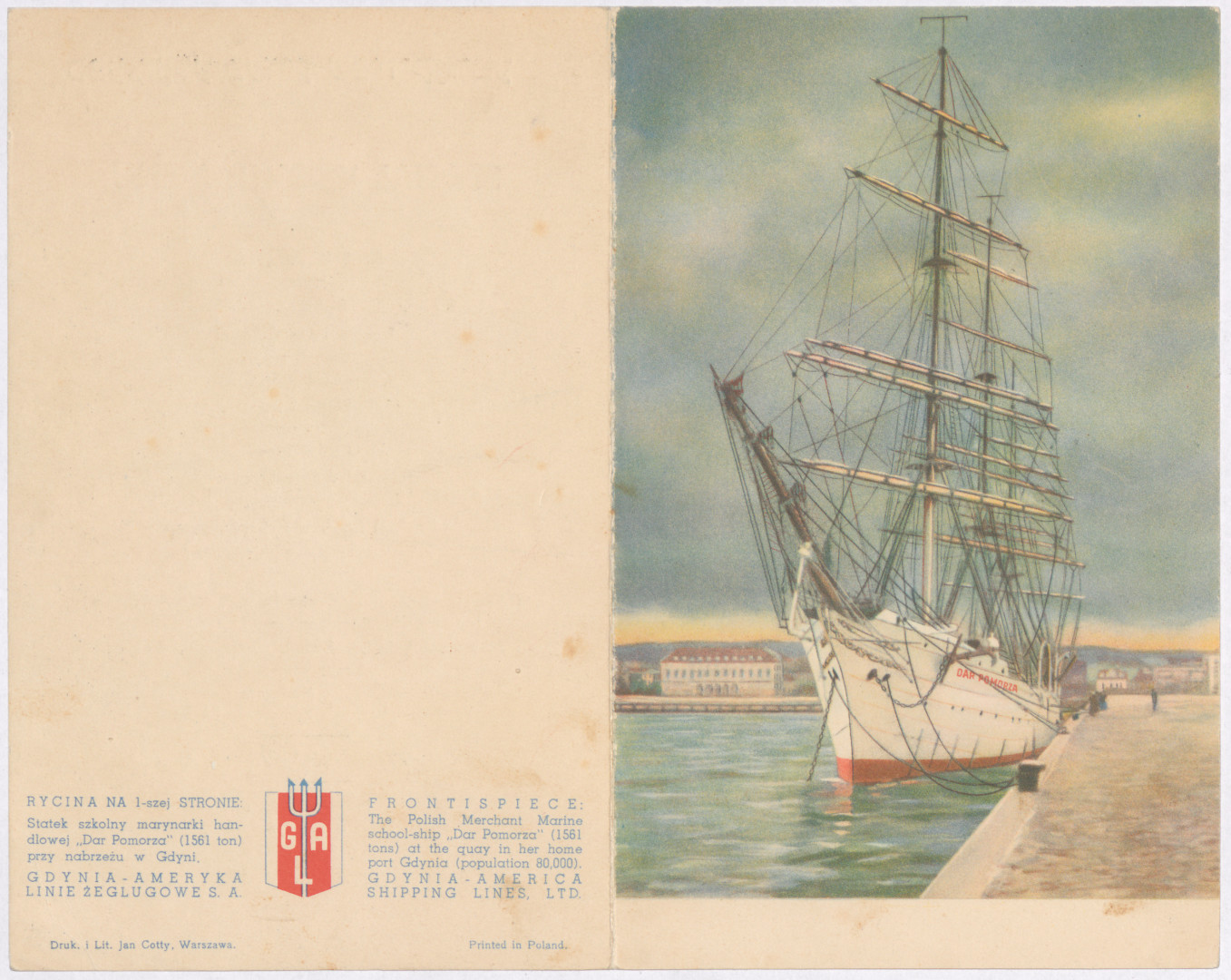 Jadłospis z MS „Piłsudski” z ilustracją przedstawiającą „Dar Pomorza” w Gdyni, zawierający spis potraw koszernych oferowanych na obiad w dniu 4.06.1937 r. Wymiary: 12,7x20,4 cm.