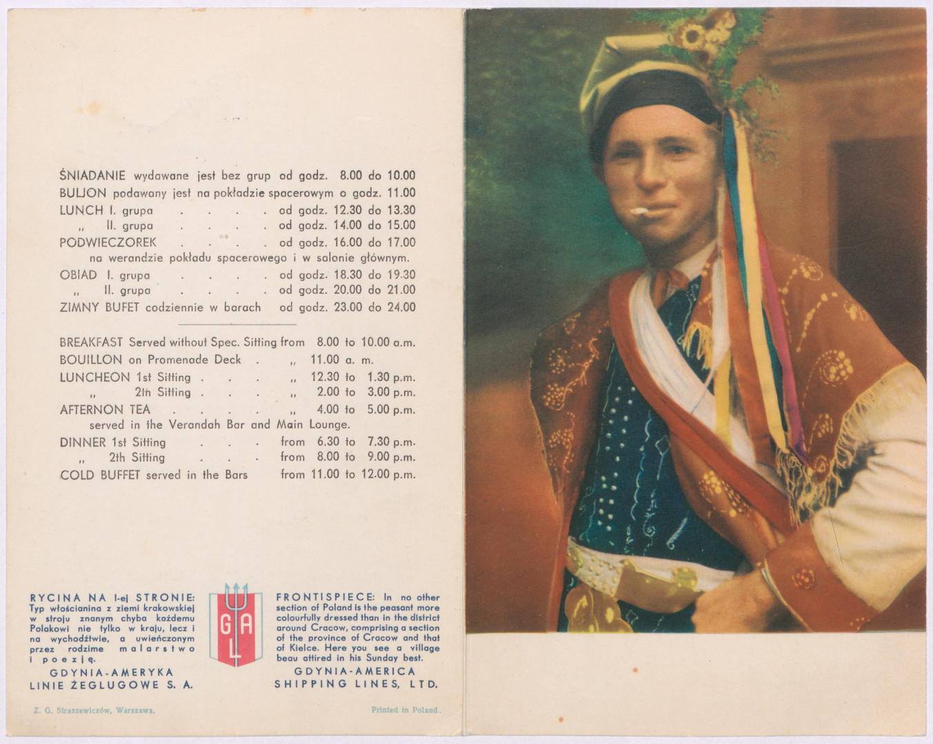 Jadłospis z MS „Piłsudski” zawierający propozycje na obiad w dniu 4.06.1937 r., a także rozkład wydawania posiłków. Na jadłospisie znajduje się rycina przedstawiająca włościanina z ziemi krakowskiej. Wymiary: 12,7x20,4 cm.