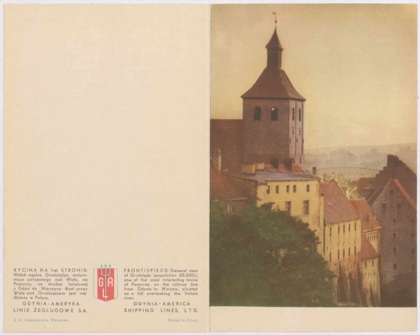 Jadłospis z MS „Piłsudski” zawierający propozycje na obiad pożegnalny w dniu 10.10.1937 r. Na jadłospisie znajduje się rycina przedstawiająca widok Grudziądza, miasta położonego na Pomorzu, nad Wisłą. Na grafice widoczny jest most nad Wisłą (zniszczony dwukrotnie podczas II Wojny Światowej, obecnie nosi nazwę Most im. Bronisława Malinowskiego w Grudziądzu). Wymiary: 14x21,5 cm.