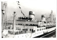 Fotografia przedstawiająca śródokręcie MS „Piłsudski” podczas podejścia do Nabrzeża Francuskiego w Gdyni. Wymiary: 18 x 13 cm.