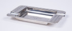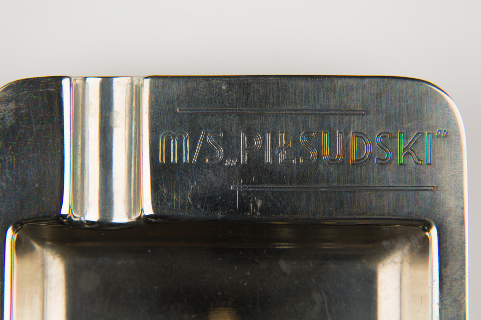 Popielniczka ze statku m.s. "Piłsudski" - wytłaczana, w kształcie prostokąta z zaoblonymi rogami. Na kołnierzu przy krótszych bokach wytłoczone po przekątnej dwa wgłębienia służące jako podpórki do papierosów. Na kołnierzu, obok wgłębień, wygrawerowany napis - u góry M.S. "PIŁSUDSKI", u dołu w trzech rzędach: GDYNIA - AMERYKA, LINIJE ŻEGLUGOWE, S.A. W centralnej części popielniczki logo GAL-u.