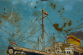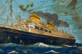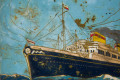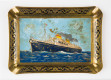 Popielniczka, która znajdowała się w każdej kabinie pasażerskiej II i III klasy na m.s. „Piłsudski”. Wykonana metodą sztancy z blachy miedzianej. Na niebieskim tle wizerunek m.s. „Piłsudski” unoszącego się na falach. Statek w kolorystyce czarno-biało-żółto-czerwonej skierowany dziobem w lewą stronę. Kołnierz miedziany pokryty częściowo wzorem czarną farbą.