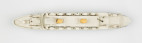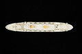 - od strony rufy: „WARSZTATY MODELI OKRĘTOWYCH ST. HR. LEDÓCHOWSKI WARSZAWA”. Przedmiot służył jako przycisk do papieru. Wymiary: długość 18 cm, wysokość 3,5 cm.