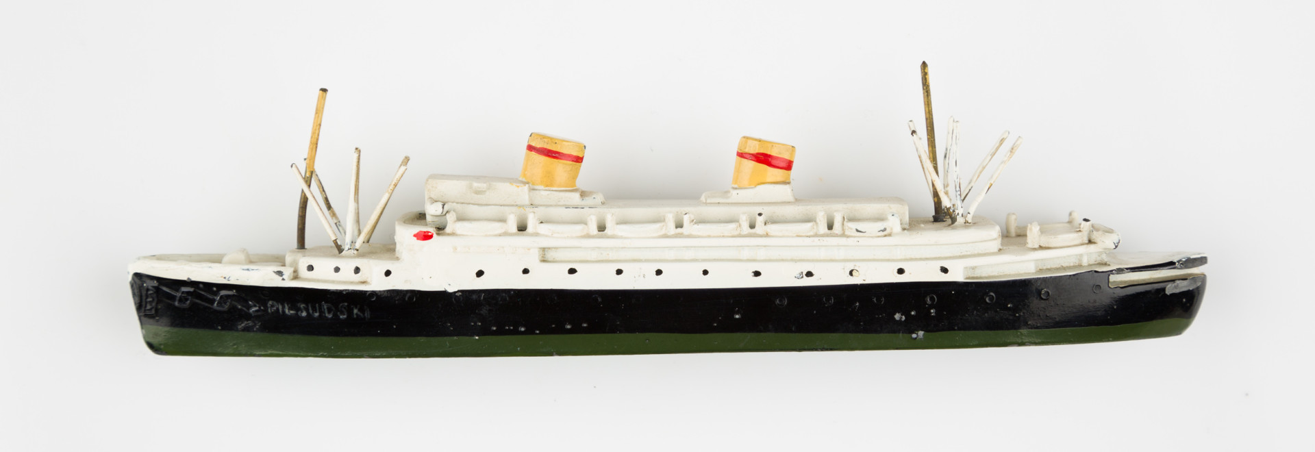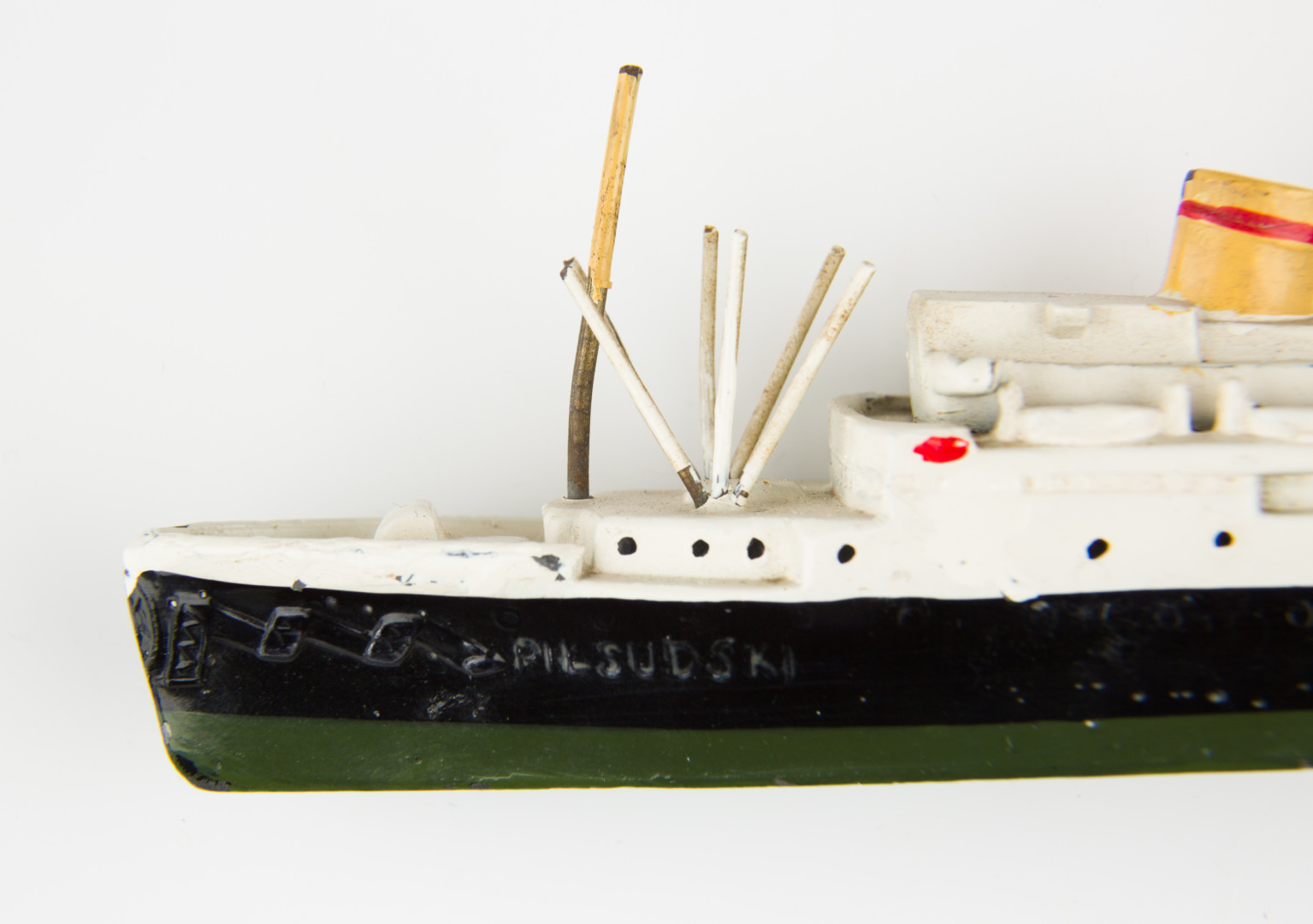Przedmiot przedstawiający sylwetkę statku pasażersko-drobnicowego MS”Piłsudski”, wykonany z metalu. Burty malowane dwoma kolorami: pas dolny kolorem khaki, zaś pas górny kolorem czarnym. Na burcie od strony dziobu napis „PIŁSUDSKI”. Górna część przedmiotu malowana na kolor biały. Szczegóły górnego poziomu potraktowano schematycznie.